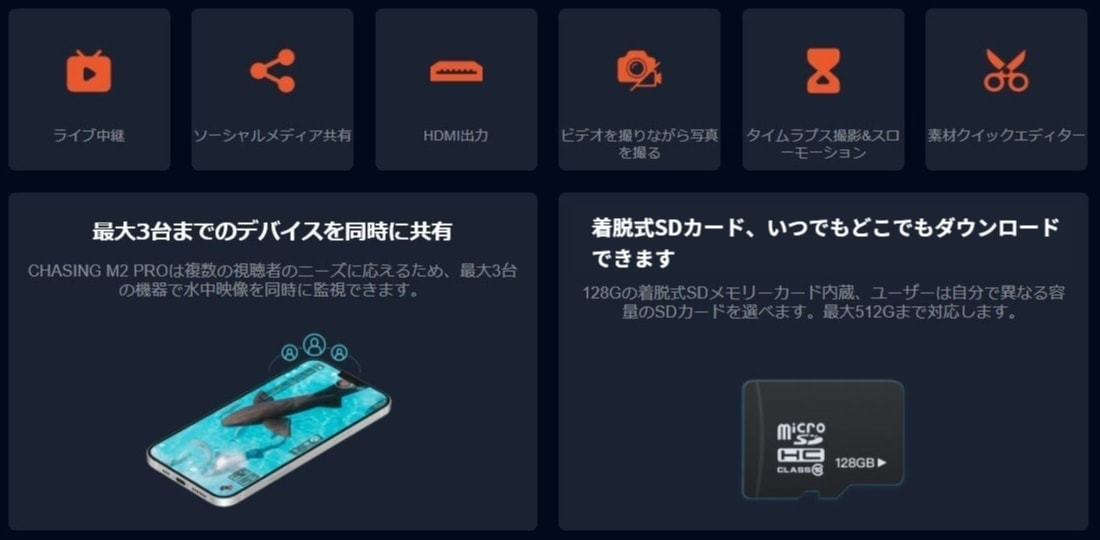CHASING M2 PROはCHASING M2のロボットアーム、サーチライト、レーザーノギスなどの汎用品を兼用する以外、高輝度スクリーンコントロールボックス、マルチインターフェースドッキングステーション、USBL水中ポジショニング、マルチビーム画像ソナー、外付けカメラなどの様々なM2 PRO専属する高級なアクセサリをサポートします。