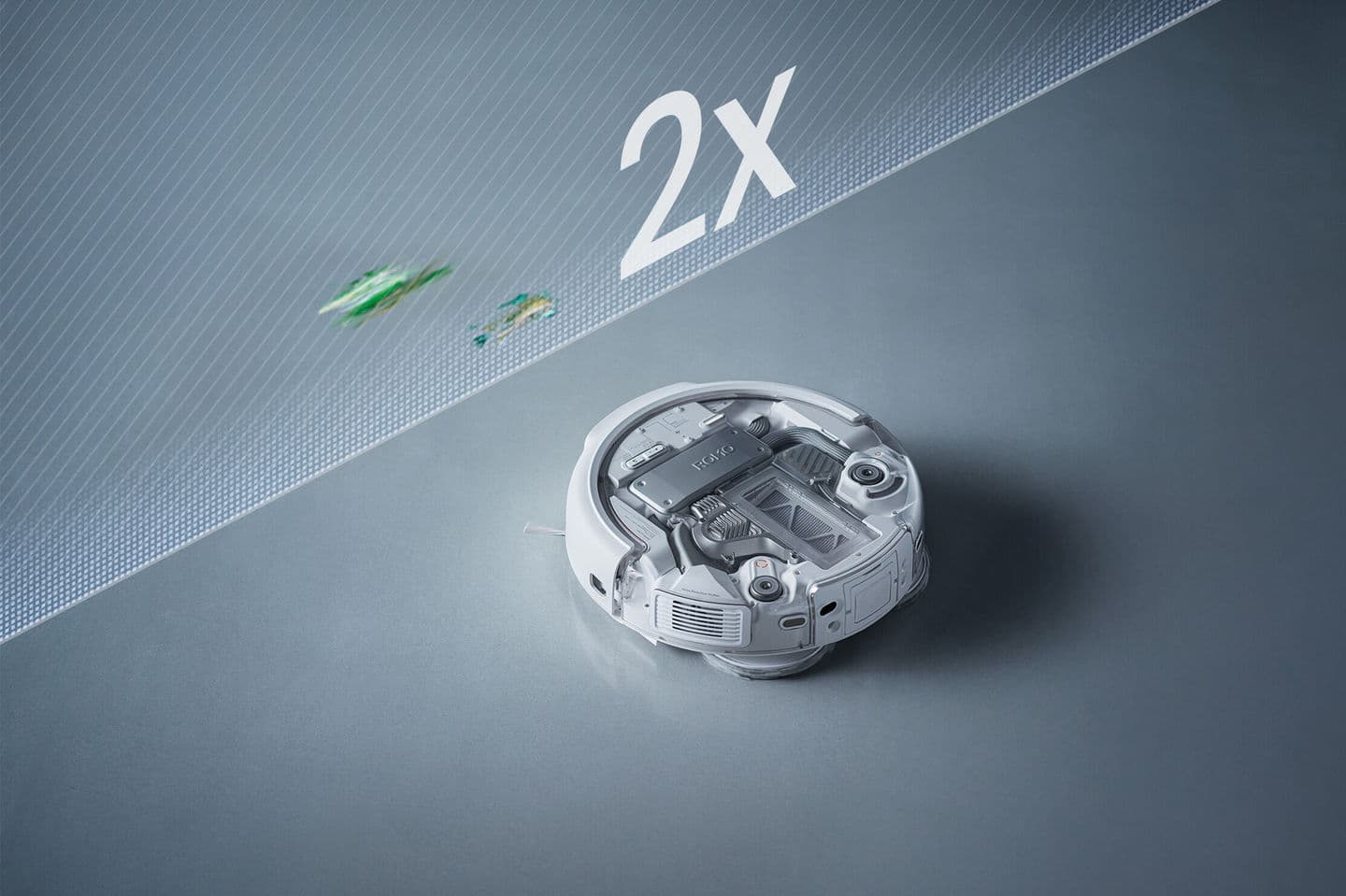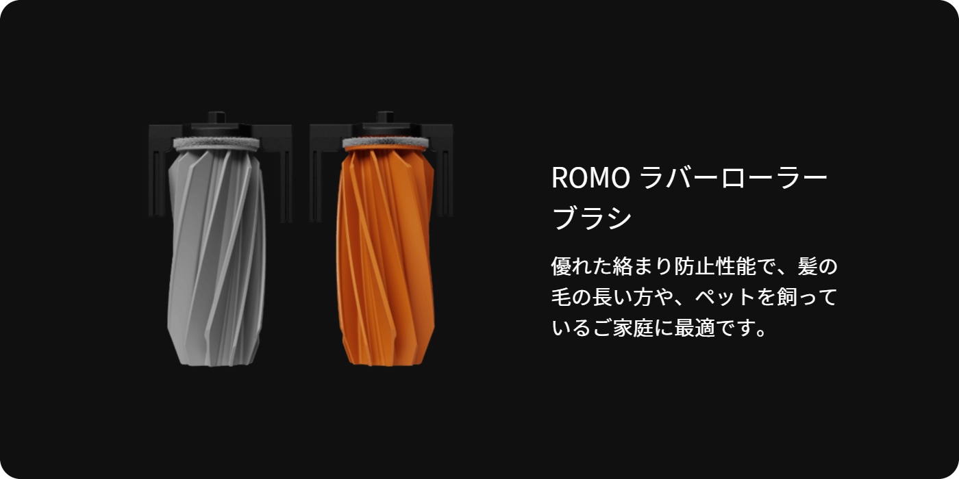 2つの高トルクモーターによって回転するROMO Pのローラーブラシは、強力な性能でゴミを中央の空洞部へ集め、効率的にゴミを吸引します。髪の毛やほこり、食べかすなのど大きなゴミを素早く吸引しながら、スムーズに掃除を行います。