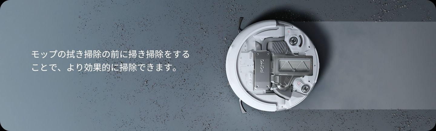 ROMO Pは、モップの拭き掃除範囲よりも掃き掃除範囲の方が広く、掃き掃除を先に行い、汚れが広がるのを防ぎます。