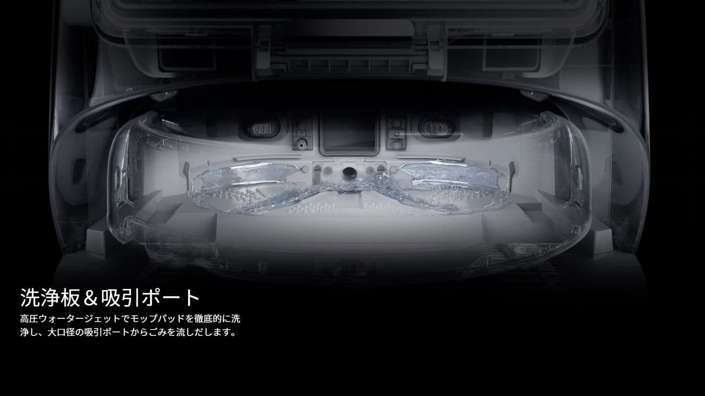 ベースステーションの洗浄板は、汚れの蓄積を防ぎ、清掃を容易にするためのシンプルなデザインが特徴です。高圧ウォータージェットでモップパッドを徹底的に洗浄し、大口径の吸引ポートからゴミを流し出します。