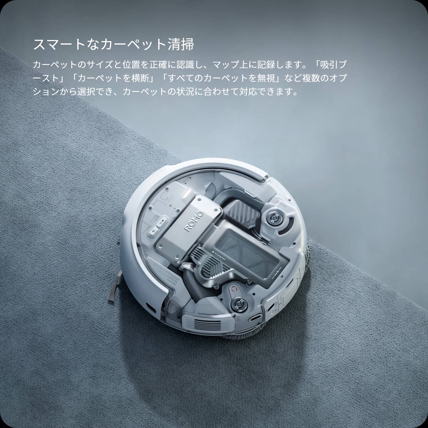 ROMO Pは、掃除機モード時やカーペットを検知した際に自動でモップを持ち上げ、拭き掃除後のモップでカーペットが汚れるのを防ぎます。