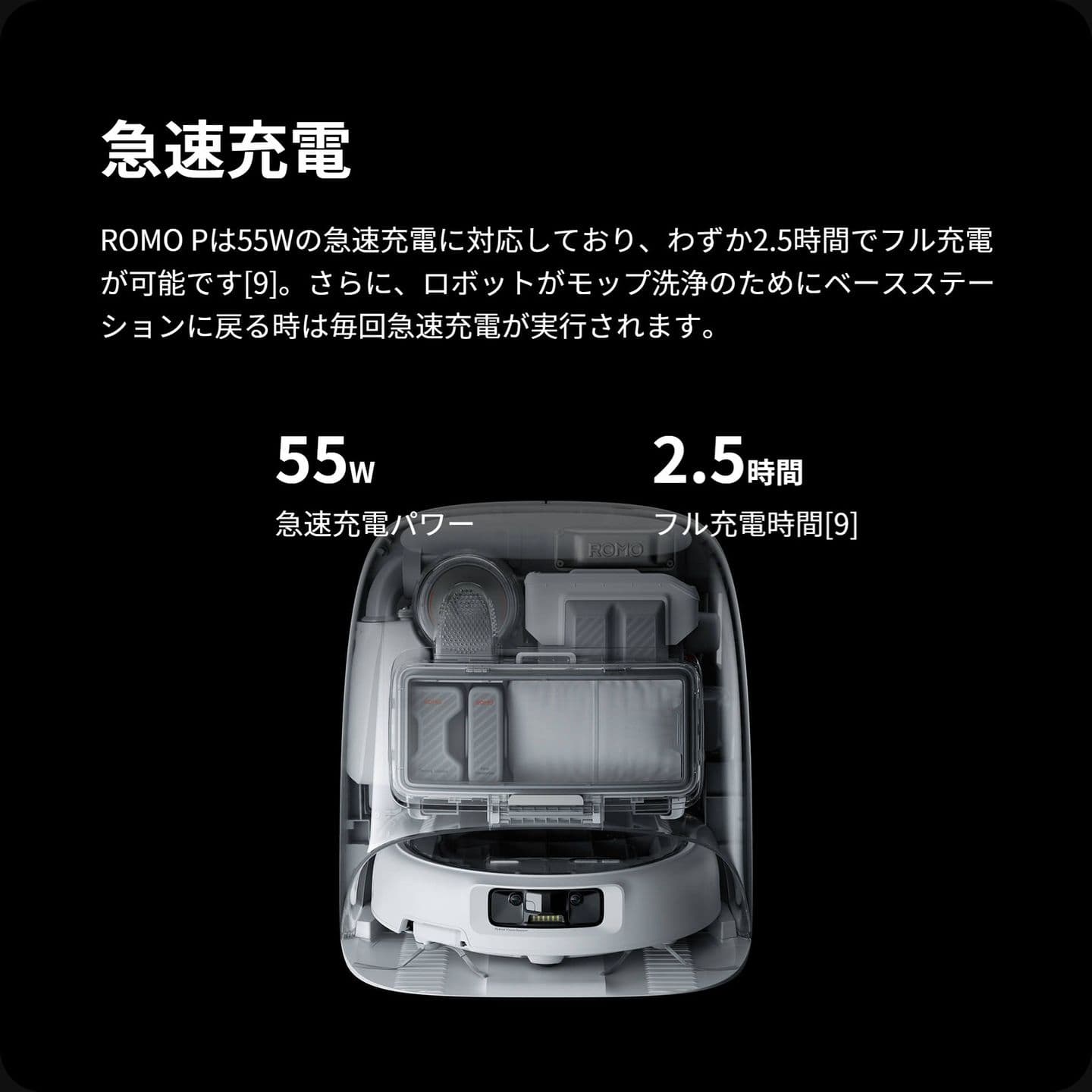 9. 0%から100%までの充電にかかる時間は、室温25°Cのラボ環境で、ロボットがベースステーションにドッキングされ、乾燥機能が無効化された状態で測定されました。実際の使用体験は、周辺環境、使用方法、ファームウェアのバージョンによって、異なる場合があります。