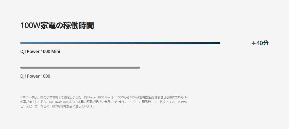 6. DJI Power 1000と比較して、DJI Power 1000 Miniは、冷蔵庫、テレビ、パソコン、ゲーム機など、定格出力が100~400Wの家電を使用する場合、約10%長い稼働時間を実現します。