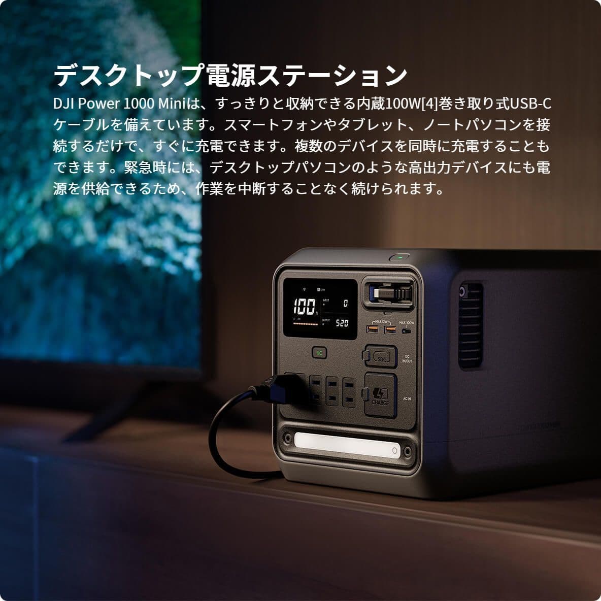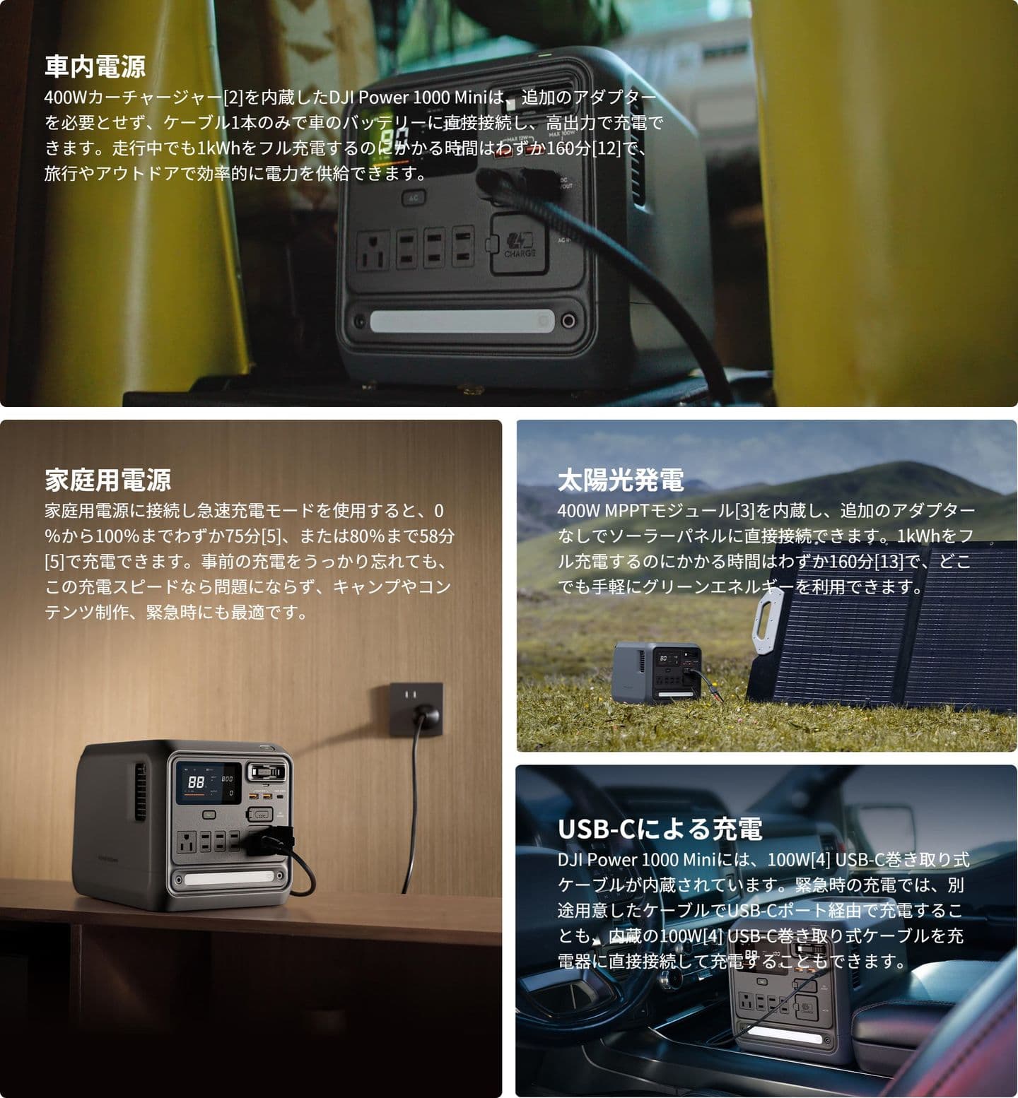 DJI Power 1000 Miniは、家庭用電源、ソーラー、車からの充電に対応しています[11]。屋内や屋外はもちろん、移動中でも、さまざまな充電方式で便利に電化製品をご利用いただけます。