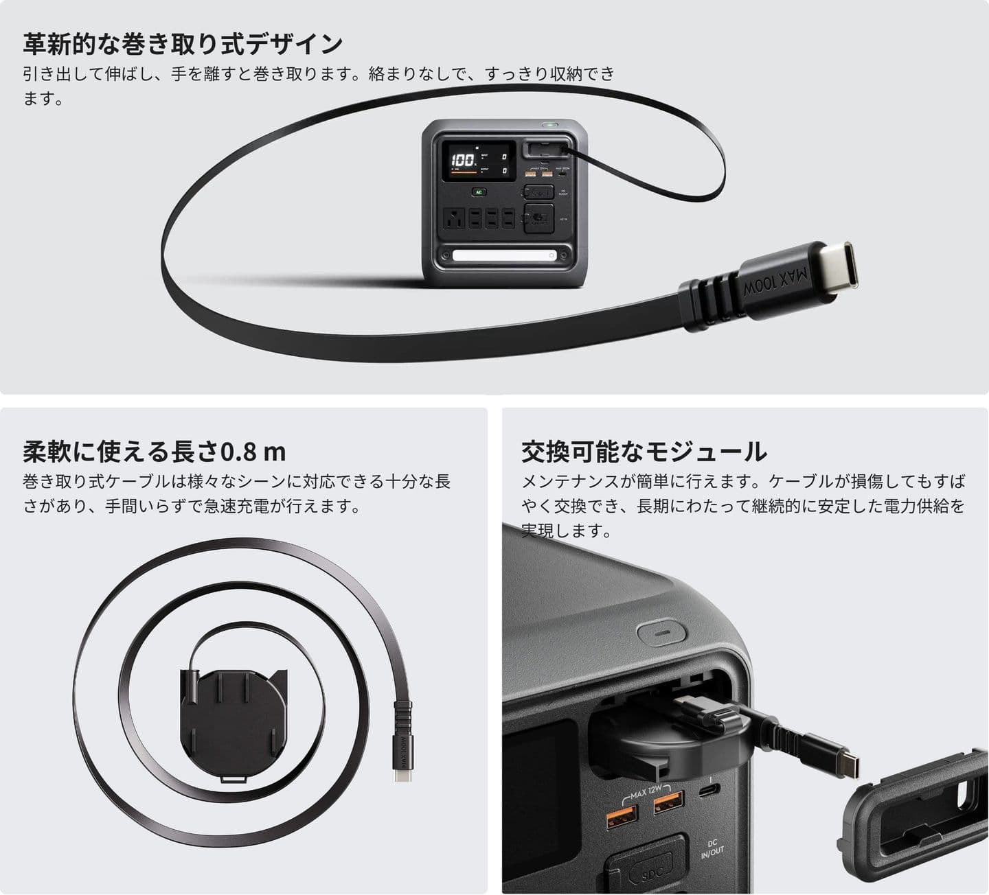 | * USB-Cポートは100 Wの最大出力に対応しています。巻き取り式ケーブルとUSB-Cポートで同時にデバイスを充電する場合、合計出力電力は150 Wであり、巻き取り式ケーブルは最大100 W、USB-Cポートは最大50 Wを供給します。 | |