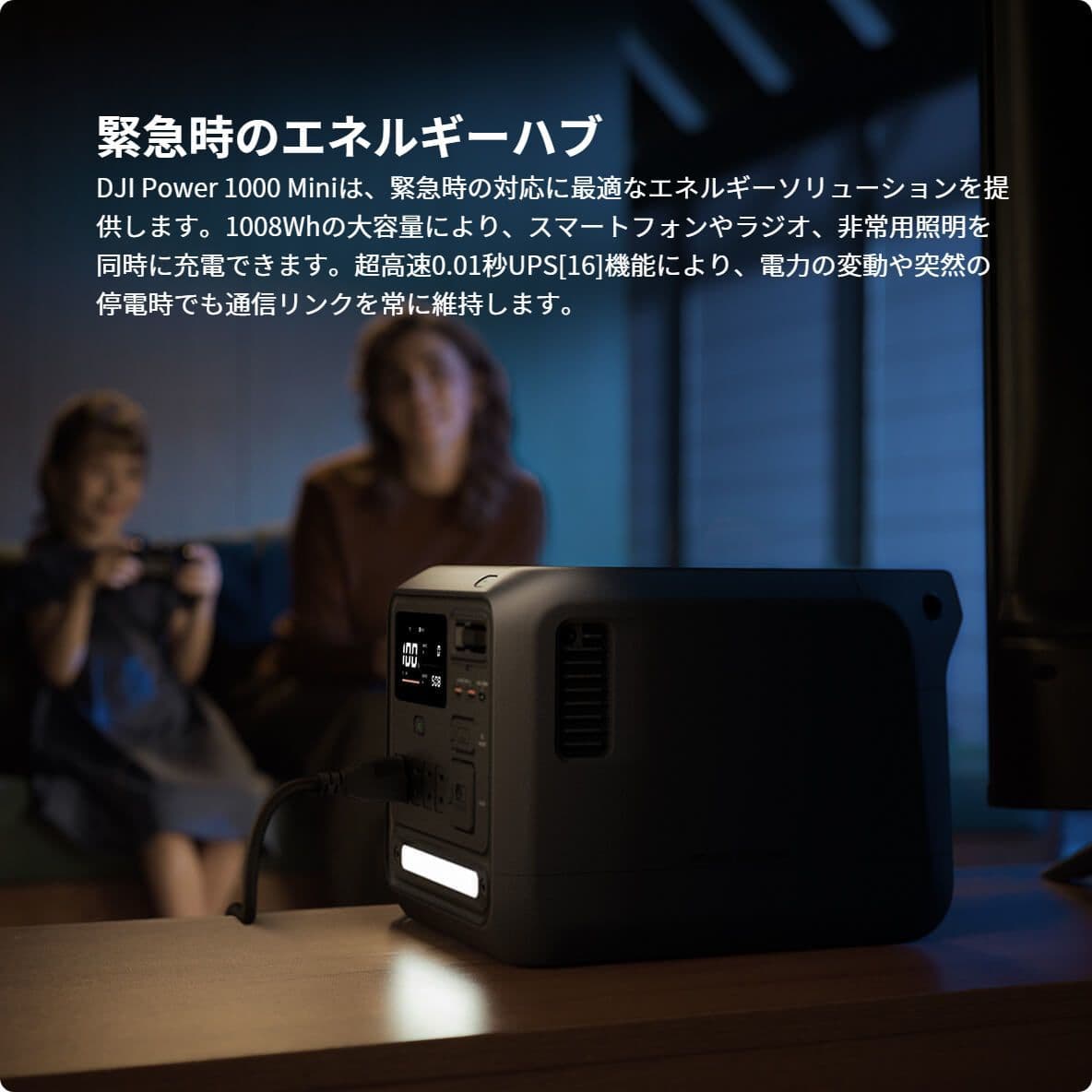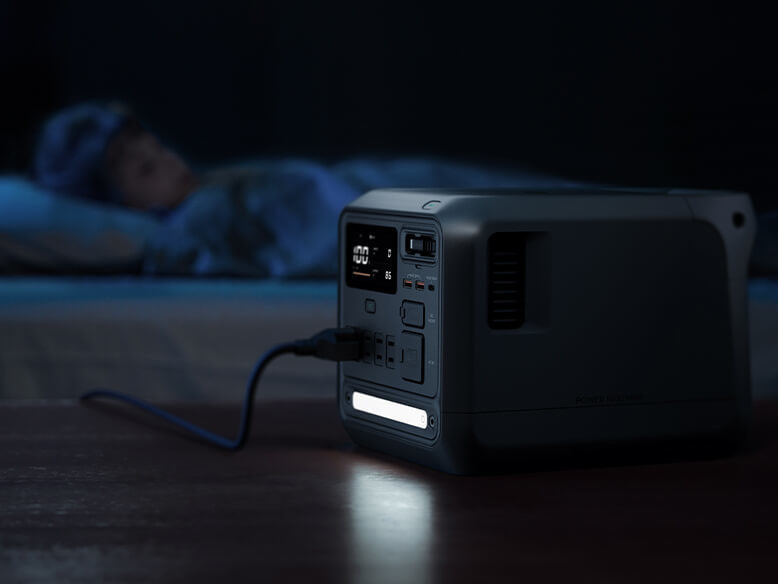 電化製品が電源の入ったDJI Power 1000 MiniにAC出力ポート経由で接続され、両方ともに家庭用電源から電力が供給されている場合、Power 1000 MiniはデフォルトでUPS(無停電電源装置)モードに入ります。急な停電が起きた場合でも、DJI Power 1000 Miniなら、0.01秒以内に接続しているデバイスへ給電を開始でき[16]、継続した運転を可能にし、安心感を提供します。
