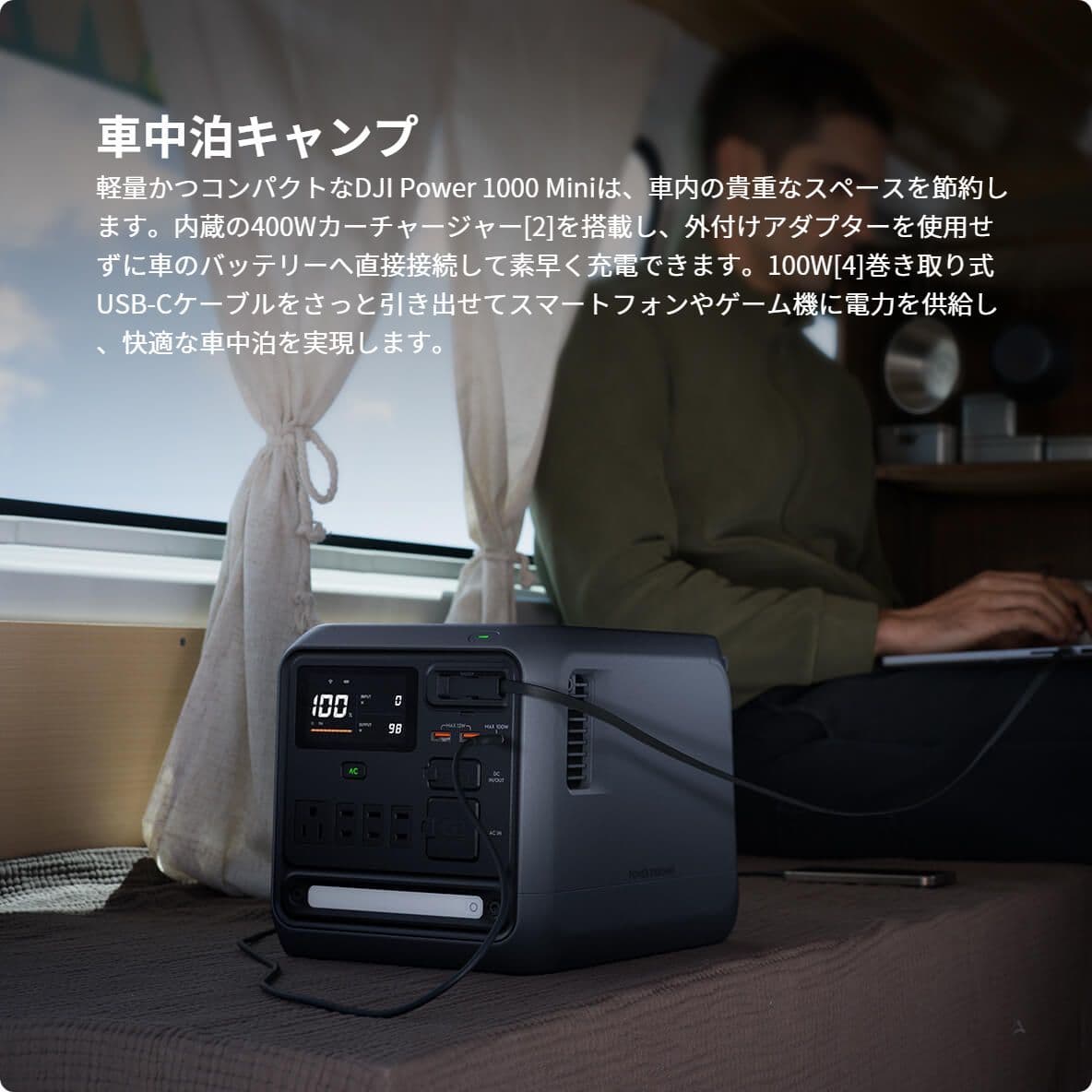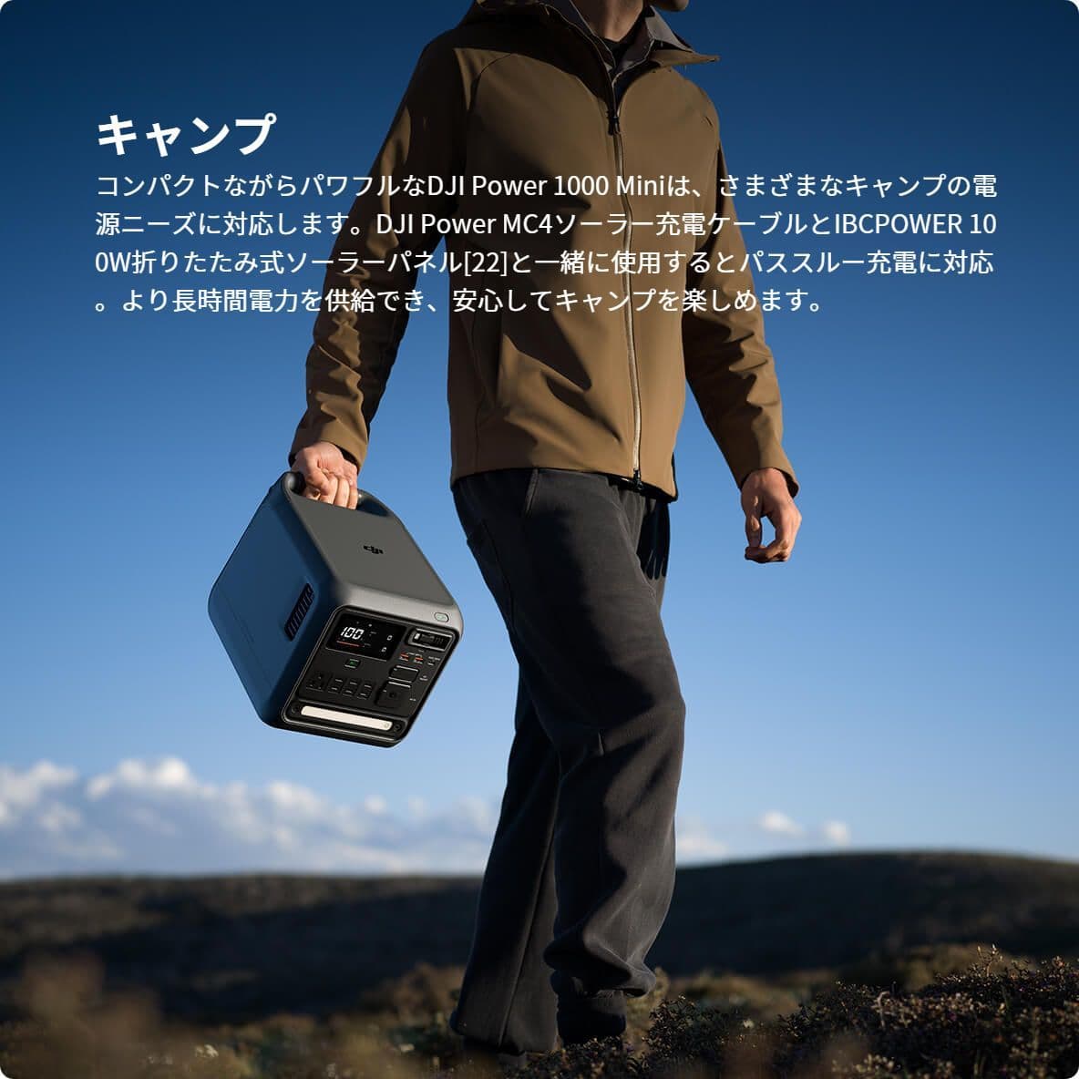 DJI Power 1000 Miniは、DJIの1kWhクラスのポータブル電源の中で最も携帯性に優れています[1]。400Wカーチャージャー[2]と400W MPPTモジュール[3]を内蔵し、キャンプやドライブ旅行、コンテンツ制作に最適です。旅先でも手軽に、パワフルに充電します。