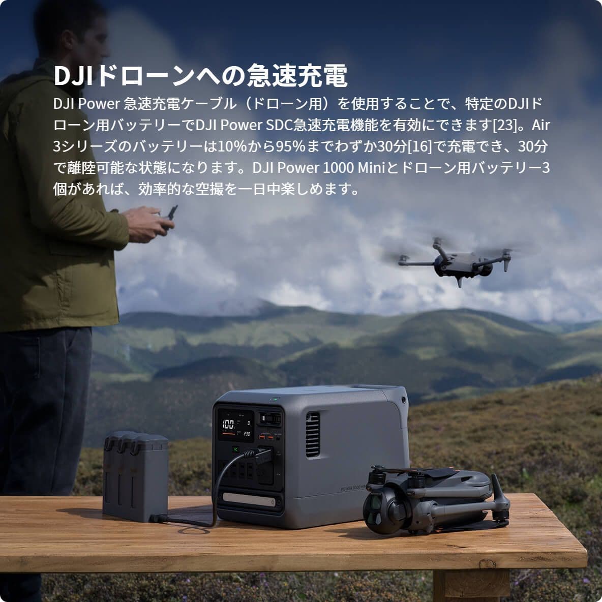 23. この機能には、別売のアクセサリーが必要です。急速充電対応DJIドローンの詳細については、公式サイトの「FAQ」ページを参照してください。