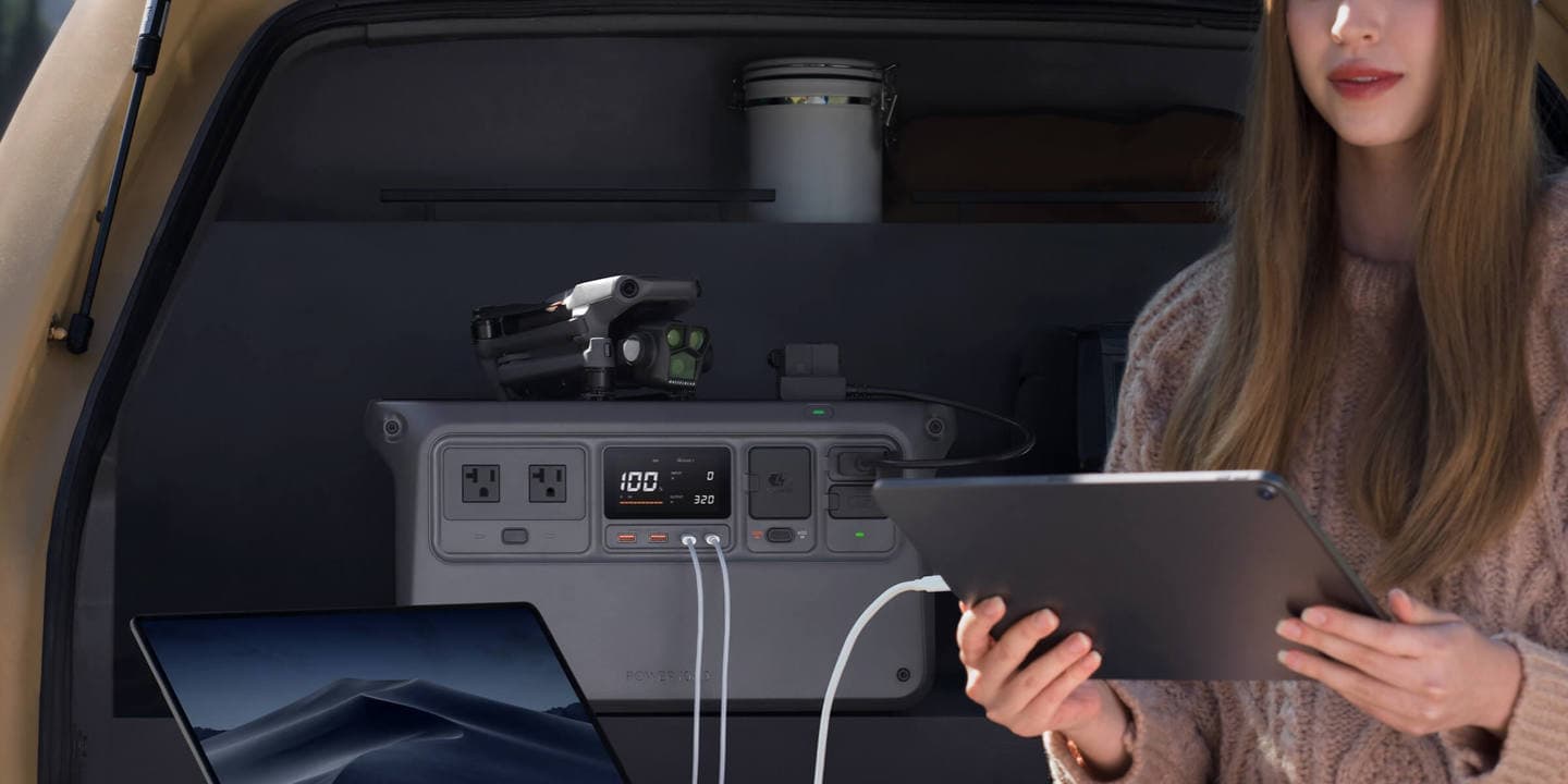 DJI Power 1000は、バッテリー容量1024 Whで、最大2000 WのAC出力を誇ります [1]。DJI製ドローンのバッテリーを急速充電することもでき、より安心して空撮のコンテンツ制作を行えます。