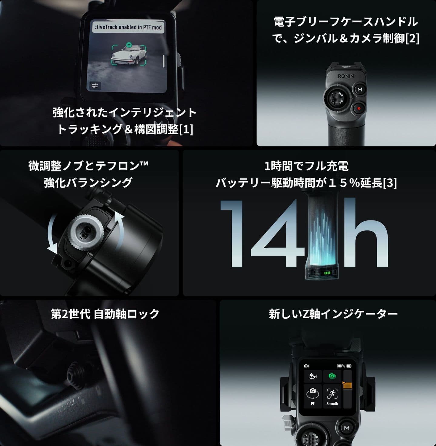 新しい電子ブリーフケースハンドル[2] は、直感的で手軽な片手操作を可能にし、よりクリエイティブなアングルのために、ジンバルとカメラを制御するジョイスティックやボタンを搭載しています。